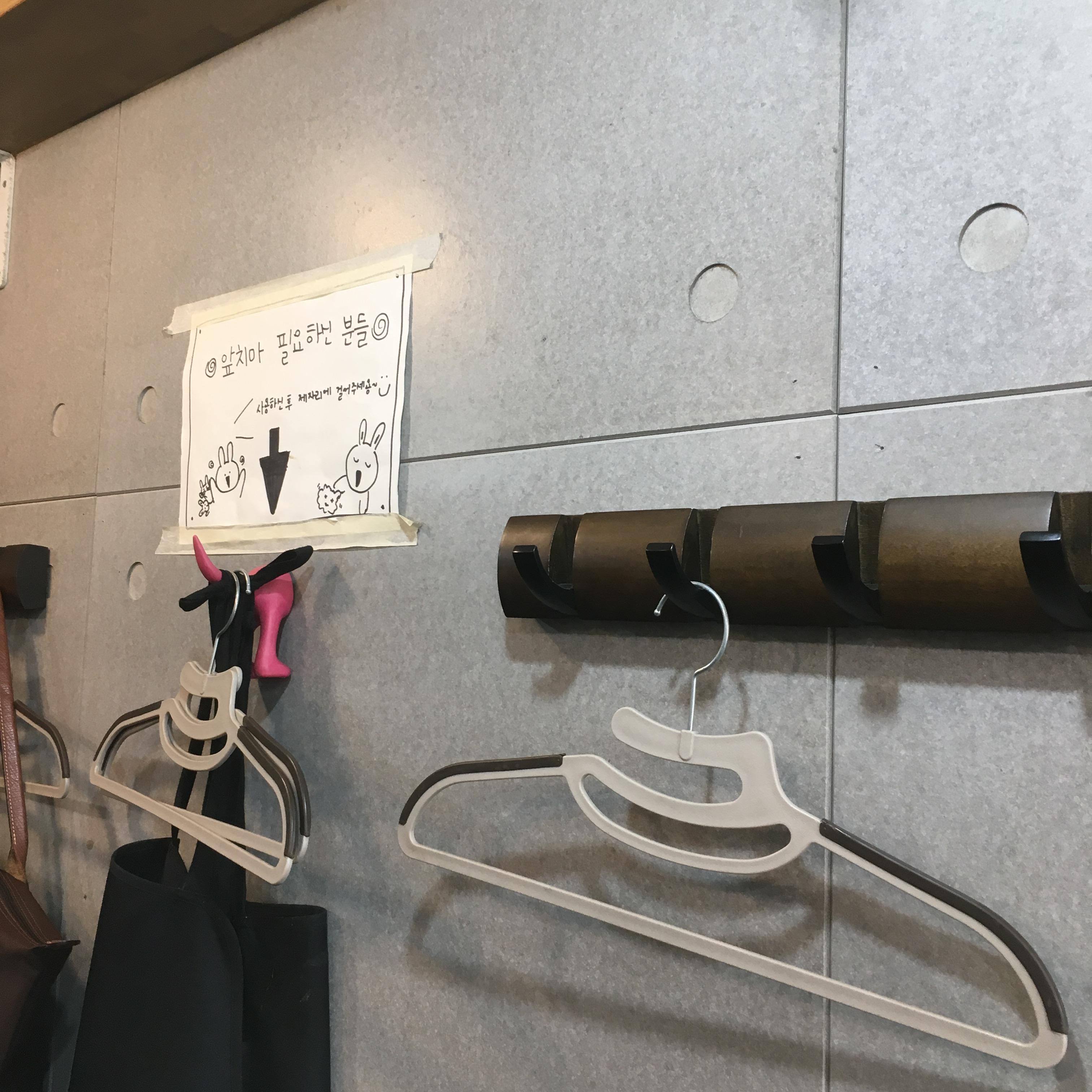 공간은 좁아도, 한쪽 벽엔는 코트류를 걸어 놓을 수 있게 옷걸이도 배치되어 있고요. 여분의 앞치마들도 준비되어 있습니다.