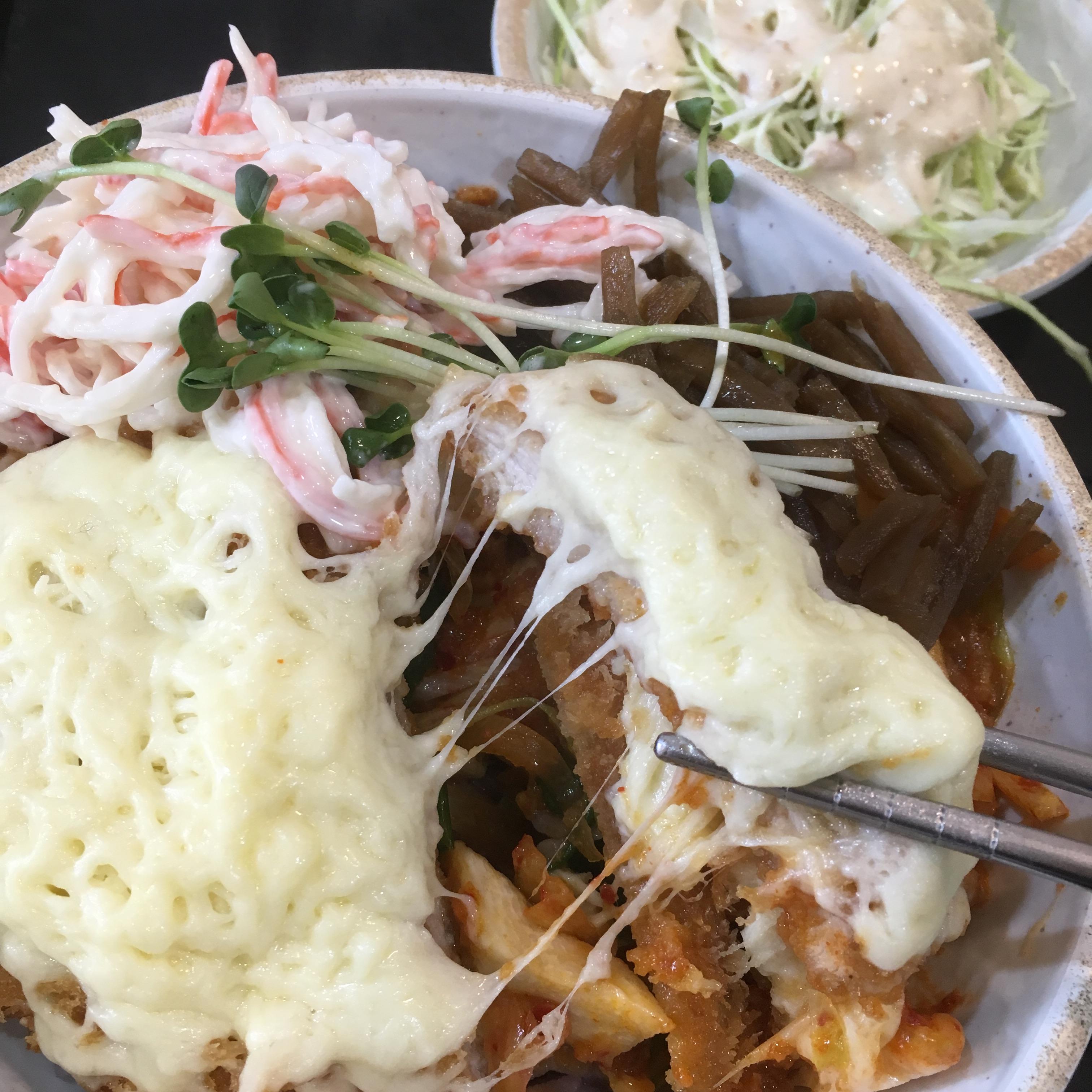 뽀얗고 쫄깃한 치즈와 돈까스도 맛있고, 한국적 돈까스 덮밥이라 그런지 사이드로 나오는 우엉도 같이 먹으니 씹는 맛도 있고 건강해지는 맛인거 같아요.